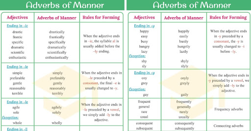 They are usually placed either after the main verb or after the object. Imagine you are reading a book… if the book doesn't contain any adverbs of manner, the reader may become uninterested. They are commonly formed by adding ly. manner adverbs have some flexibility in where they are placed, but precisely where they are positioned determines their function. Adverbs of manner help the listener gain a better understanding of the context. A few adverbs of manner have the same form as the adjective :